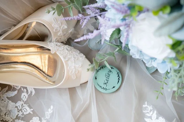Kelley was an awesome bride to work with! Her order of a bridal bouquet and matching groom’s boutonniere for her wedding was fun to design, and I loved the softness of the look we came up with together! Let’s take a look at Kelley’s light blue, lavender and white silk wedding flowers in these photographs from Kerri Ann Photography!