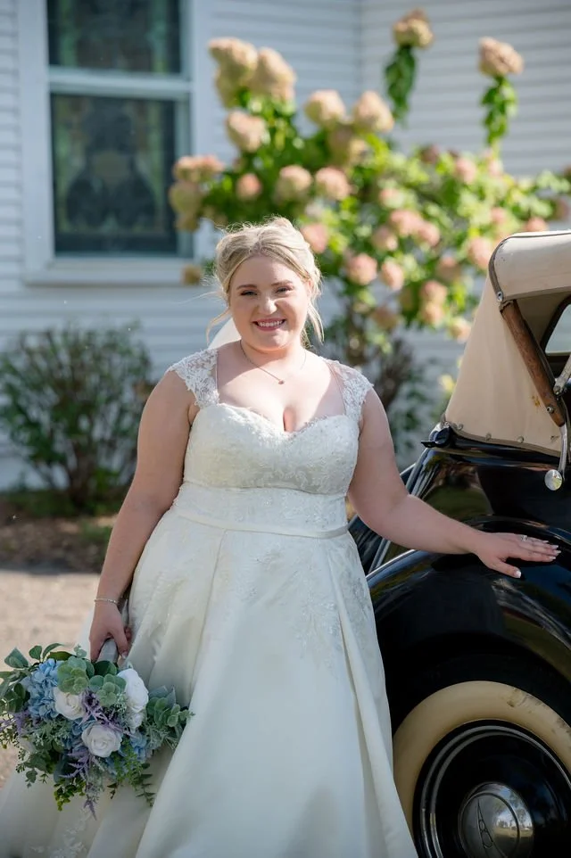 Here’s my awesome bride Kelley! Her bouquet was a round handtied style with a mix of blue Hydrangea, white Garden Roses, lavender Astilbe, Lamb’s Ear and Eucalyptus. It was classic and also a good mix of traditional with some interesting texture thrown in there. It looked pretty good alongside her amazing dress and this awesome vintage car;)