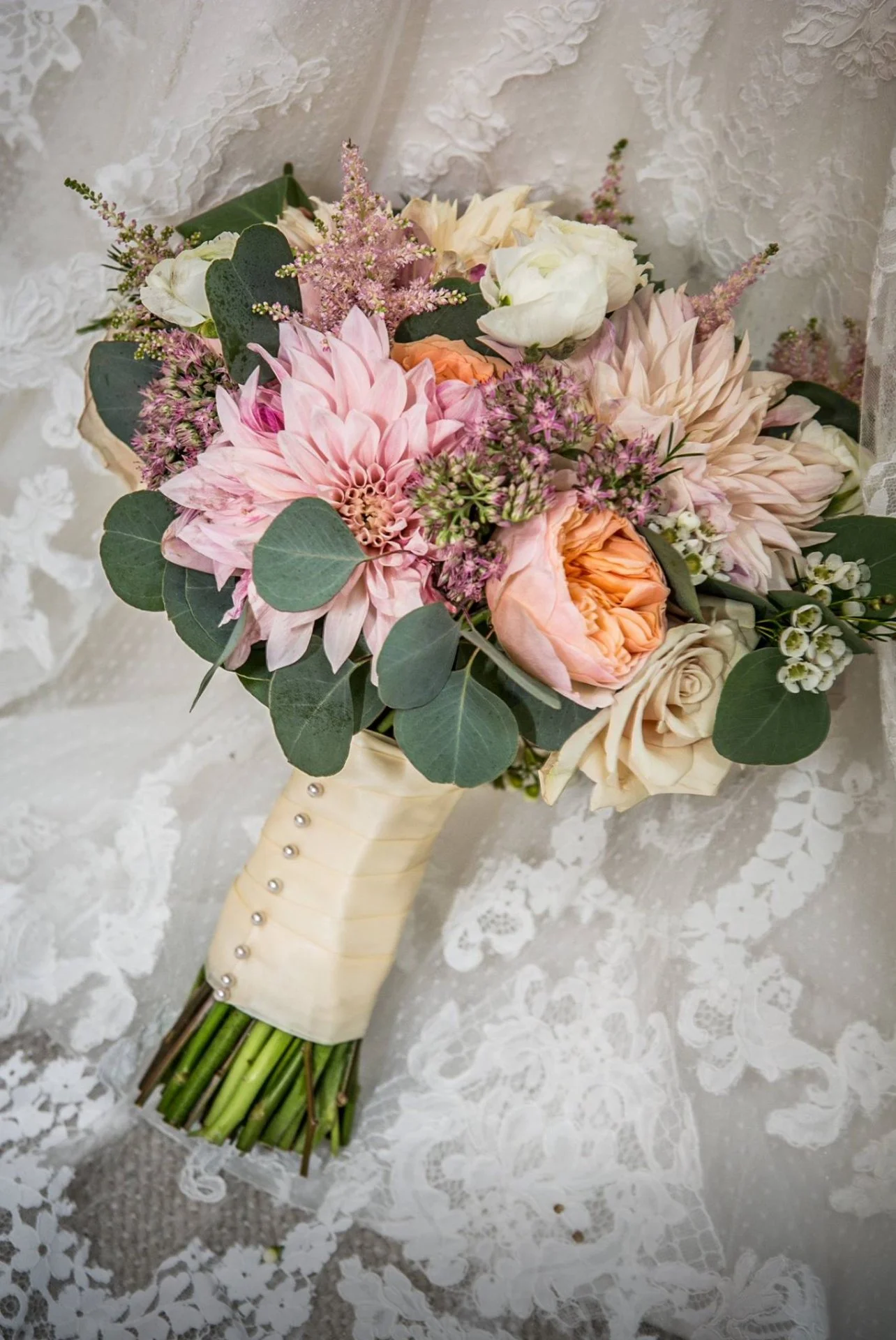The original bouquet was a round, handtied style with pink Dahlia, nude/champagne Dahlia, white Dahlia, white Ranunculus, peach Cabbage Roses, Succulents, pink Astilbe, Waxflower, Silver Dollar Eucalyptus and pink Succulent flowers. It was bright and whimsical and full of texture!