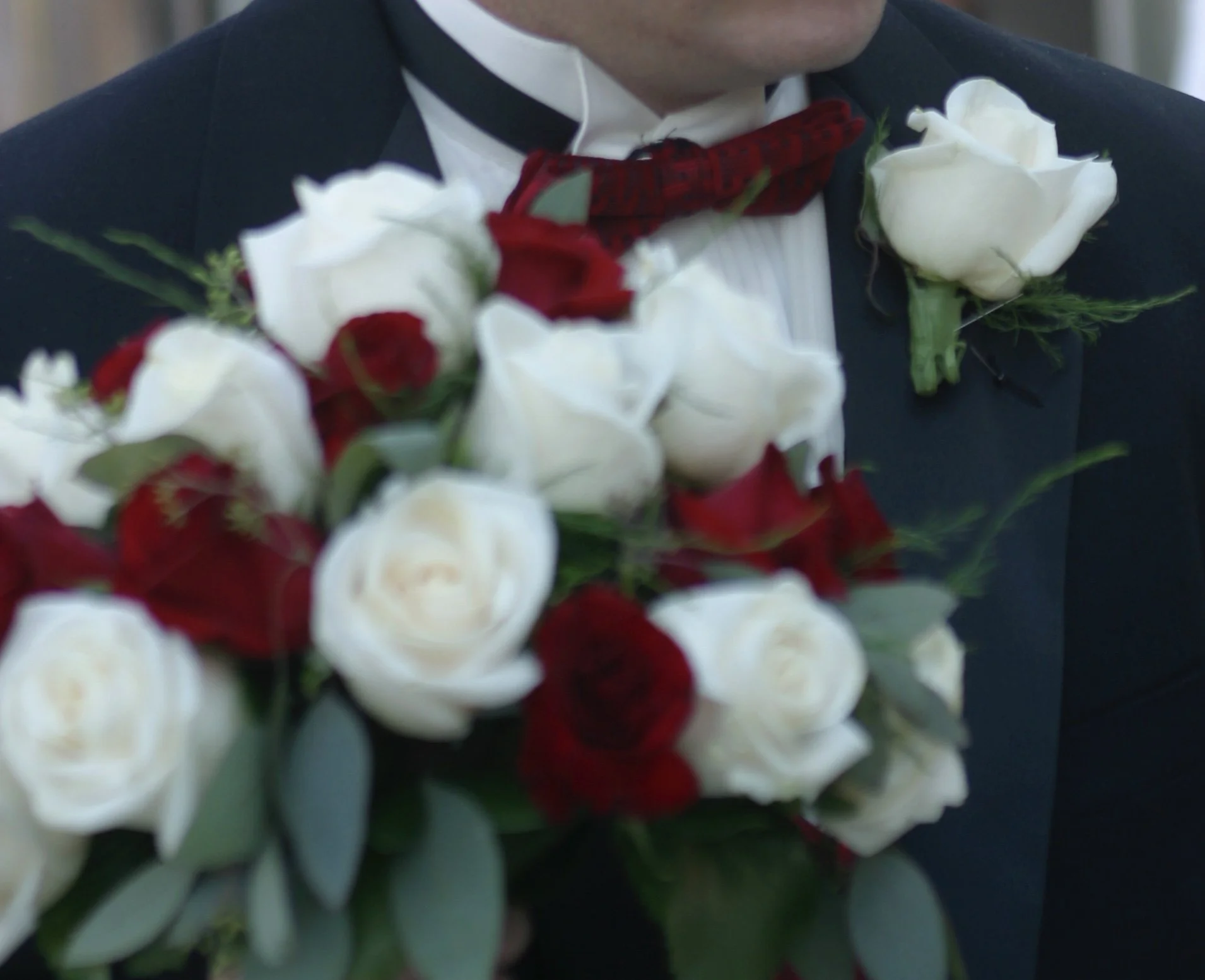 The original bouquet was a mix of white and red Garden Roses, Seeded Eucalyptus and small filler greenery. Andy thought it was originally constructed in a bouquet holder, so I kept the stems thin and wrapped them fully in white ribbon to mimic the look.